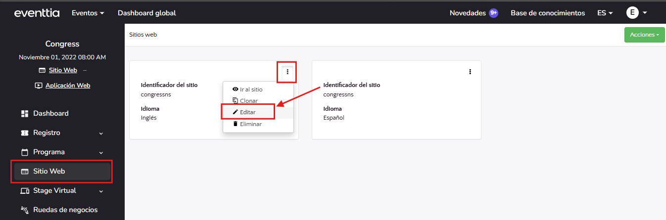 - Ve al evento en el que estás trabajando y selecciona el módulo de “Sitio web”.