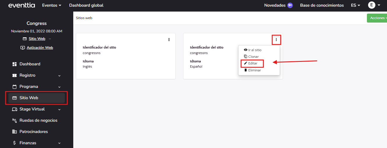 Para comenzar, ve al editor web navegando al módulo "Sitio web", luego haz clic en los tres puntos y selecciona "Editar".