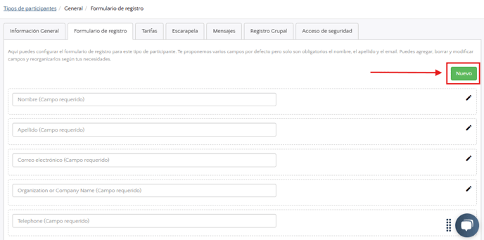 - Crea el campo que deseas mostrar en la app de Check-in al escanear los códigos QR haciendo clic en Nuevo.