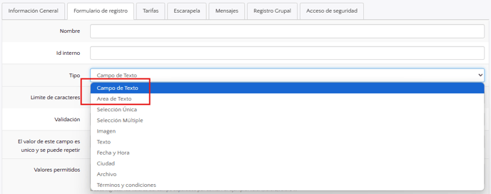 - Y en la página de creación del campo, asegúrate de seleccionar el tipo de respuesta Campo de texto o Área de texto.