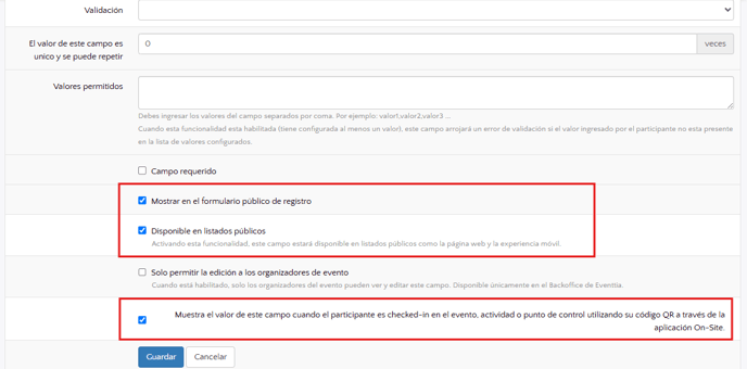 Una vez que selecciones Campo de texto o Área de texto como tipo de respuesta para tu nuevo campo, tendrás la opción de agregar este campo como información visible en la app de Check-in. Esta opción es la última y se llama: Muestra el valor de este campo cuando el participante es checked-in en el evento, actividad o punto de control utilizando su código QR a través de la aplicación On-Site. Marca esta casilla para que el valor del campo se muestre al escanear el código QR del participante.