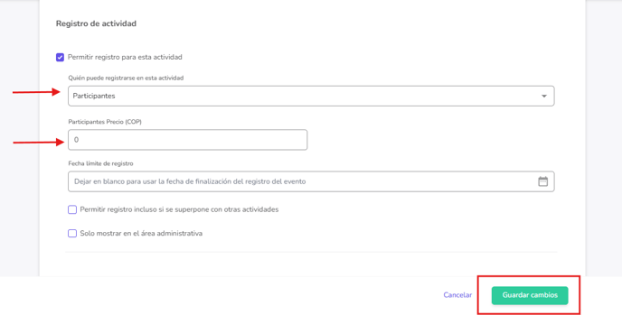 - Luego puedes escoger los tipos de participantes que pueden registrarse para la actividad, y su precio (si hay uno, sino déjalo en 0).