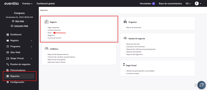 - Deberás ir al módulo de "Reportes", después "Registro" y finalmente seleccionas "Taller"