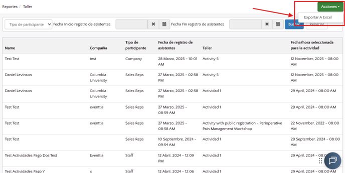 - Una vez dentro vas a poder ver el registro a las actividades de todos los participantes. Para descargarlo y ver el check-in a cada una de esas da click en el botón "Acciones" y luego "Exportar A Excel".