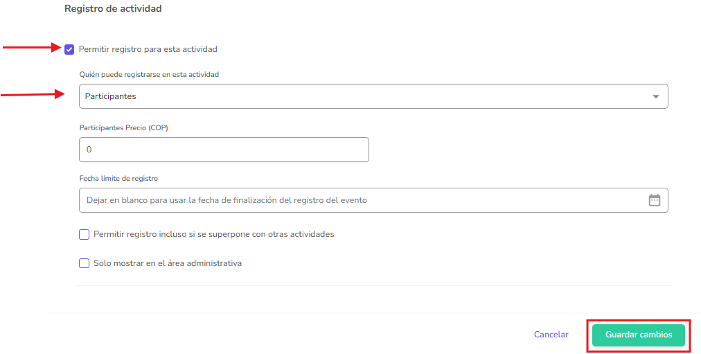 Nota importante: Para que los participantes puedan ver correctamente las actividades, todas deberán tener configurado qué tipo de participante puede verlas, si un tipo de participante no está seleccionado entonces no podrá visualizar esa actividad en específico