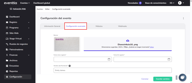 - Una vez estés en el evento dirígete a la seccion de "Configuracion" que te aparece en la parte inferior de la pagina y luego a la pestaña de "Configuración avanzada"