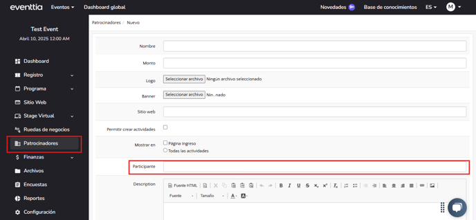 Nota importante: El representante a asignar deberá estar previamente registrado al evento como participante para poder ser asignado al patrocinador.