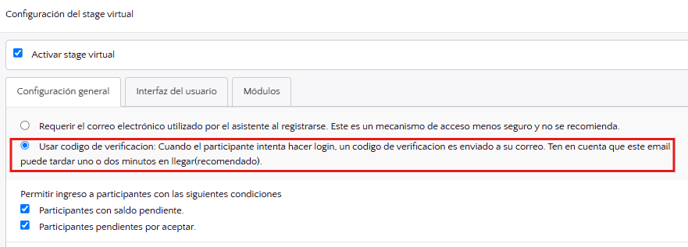 MUY IMPORTANTE: Para habilitar esta funcionalidad, asegúrate de que el modo de acceso al escenario virtual esté configurado como “correo electrónico + código de verificación”.