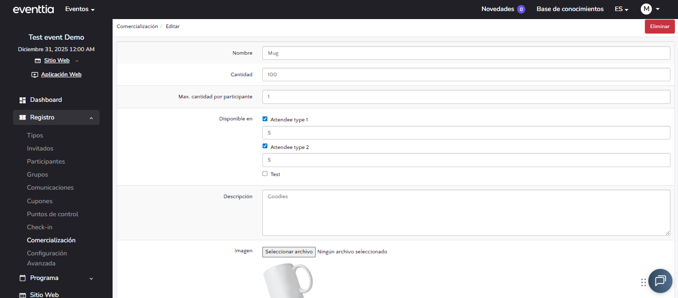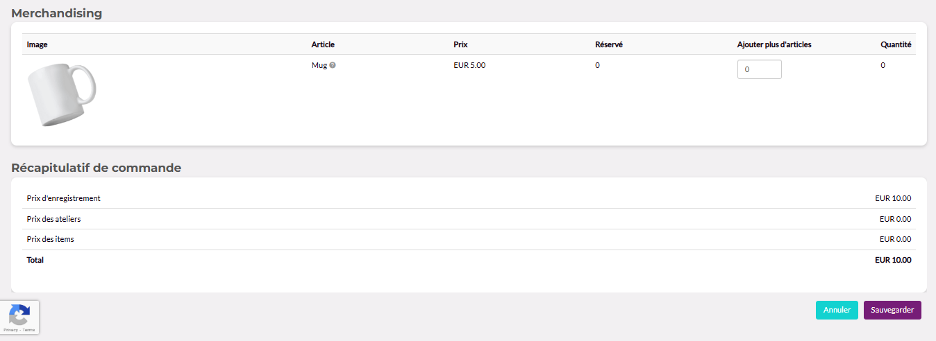 - Si un participante compra un artículo, el precio se agregará al precio total de registro. La opción de comprarlo aparece en el formulario de registro.