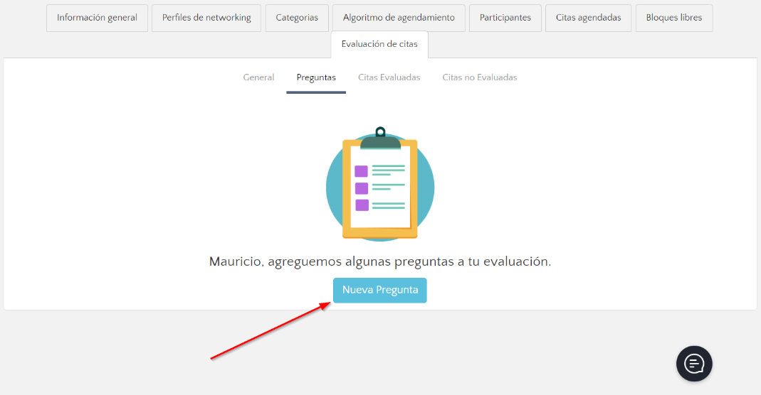 Haz clic en la segunda pestaña "preguntas" y luego en "nueva pregunta" para empezar a crear tu evaluación de citas: