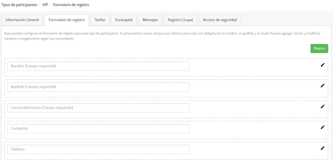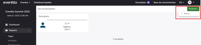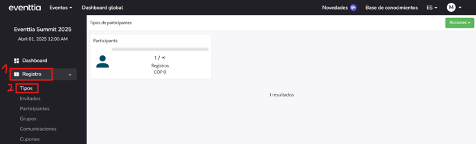 Al crear tu evento te aparecerá un tipo de participante por defecto llamado "participante". Puedes personalizarlo y crear otros tipos si es necesario.
