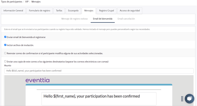 - Mensajes: En esta sección podrás configurar los diferentes mensajes que se envían automáticamente durante el proceso de registro, como el mensaje de 'Registro Exitoso' (que aparece en pantalla una vez se envía el formulario) y el correo de bienvenida (que se envía a los participantes al completar su registro).