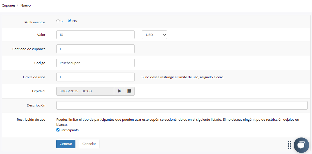 Nota importante: Cuando un cupón es utilizado por al menos un participante el sistema bloquea la opción de eliminarse para evitar problemas en los pagos realizados.