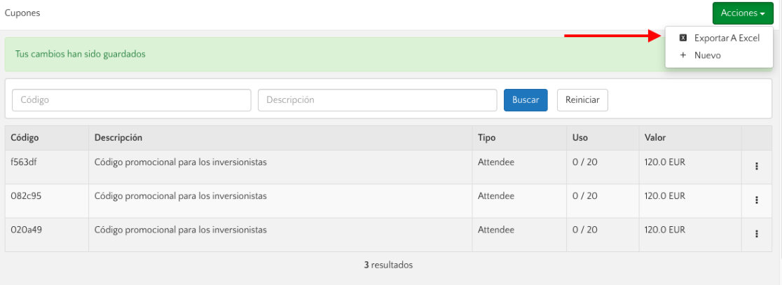 - Puedes descargar un archivo Excel con todos los códigos de los cupones haciendo clic en el botón verde "acciones" en la parte superior derecha de la pantalla y después "Exportar a excel".