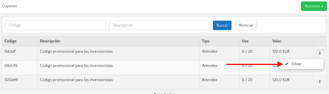 - Puedes editar cada cupón antes de que se usa. Para hacerlo, ve a la pestaña de "Cupones" y haz clic en los tres puntos verticales en la parte derecha de la pantalla. Haz clic en "Editar".