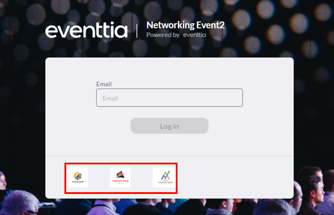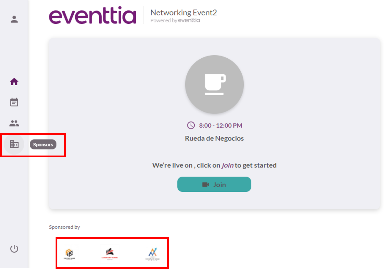 - Los logotipos de tus patrocinadores se mostrarán en la página principal del Escenario Virtual. Si tienes más de cinco patrocinadores, sus logotipos rotarán en un formato de carrusel.