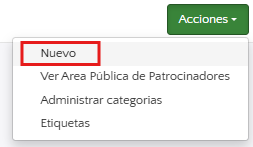 - Comienza a agregar los diferentes patrocinadores haciendo clic en el botón verde Acciones, seleccionando Nuevo y luego ingresando la información y el logotipo.