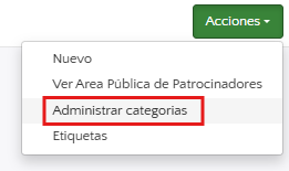 - Con nuestra nueva funcionalidad de “Categorías” podrás agrupar a tus patrocinadores como mejor te convenga. Siguiendo las mismas instrucciones del Paso 1, haz clic en el botón “Acciones” y selecciona “Administrar categorías”.