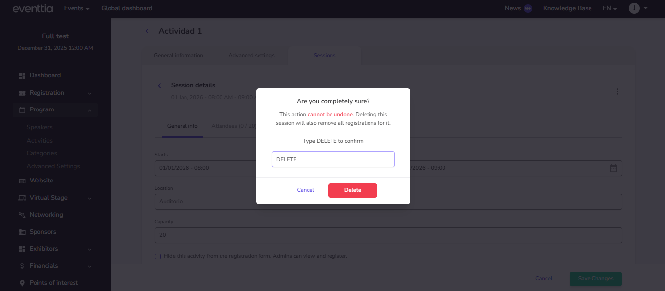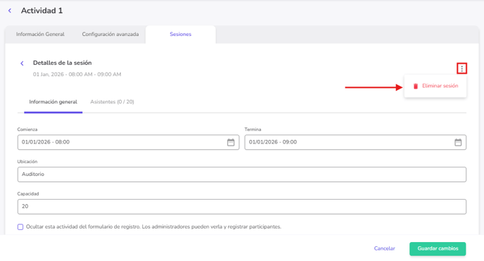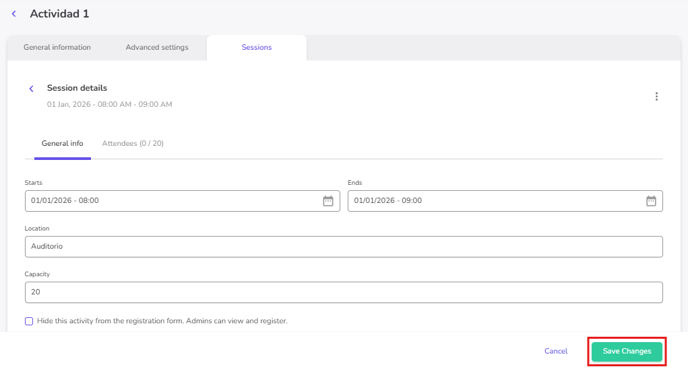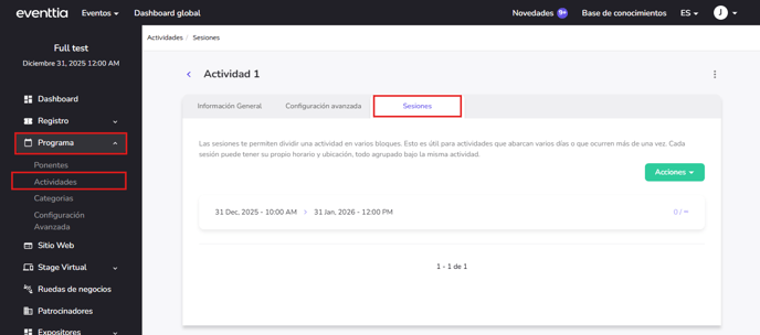 - Una vez que tu actividad esté creada y guardada, y después de haber configurado su Información general y Configuración avanzada, podrás comenzar a agregar sesiones desde la pestaña Sesiones.