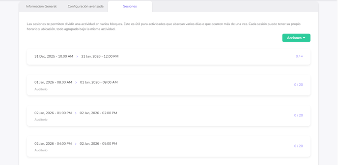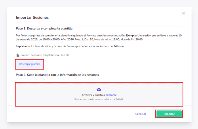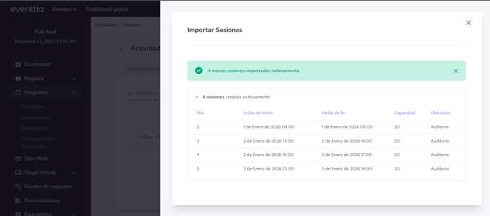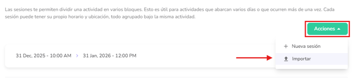En este artículo, aprenderás cómo cargar múltiples sesiones de una sola vez utilizando la herramienta de importación. Esta funcionalidad es muy útil si tu actividad incluye varios horarios, sesiones recurrentes o se extiende durante varios días.