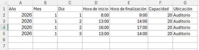 Abre el archivo de Excel que se descargó y completa toda la información requerida para cada sesión/franja horaria, como: