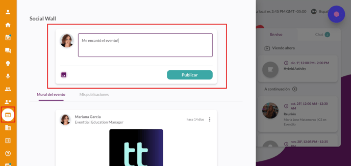 - Tus participantes podrán publicar comentarios y agregar imágenes o fotos en el muro social para que los demás asistentes sepan cómo están disfrutando del evento.