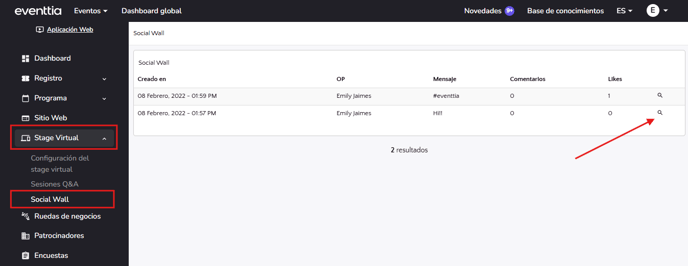 - Si quieres eliminar un comentario, puedes volver a Eventtia, ir al módulo de Stage Virtual y luego a "Social Wall".