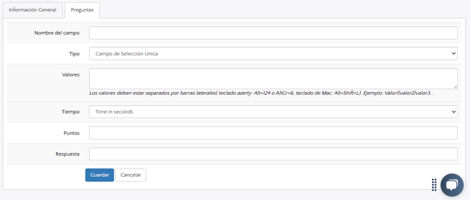 Tiempo: Establece el tiempo que tendrá el usuario para responder la pregunta.