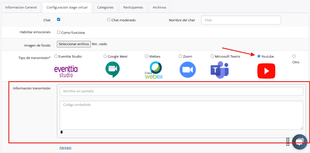 - Ahora ve a tu actividad dentro de eventtia y en la pestaña de "Configuración del Stage Virtual" selecciona Youtube como plataforma de transmisión, deberás colocar el código que copiaste dentro del recuadro de transmisión.