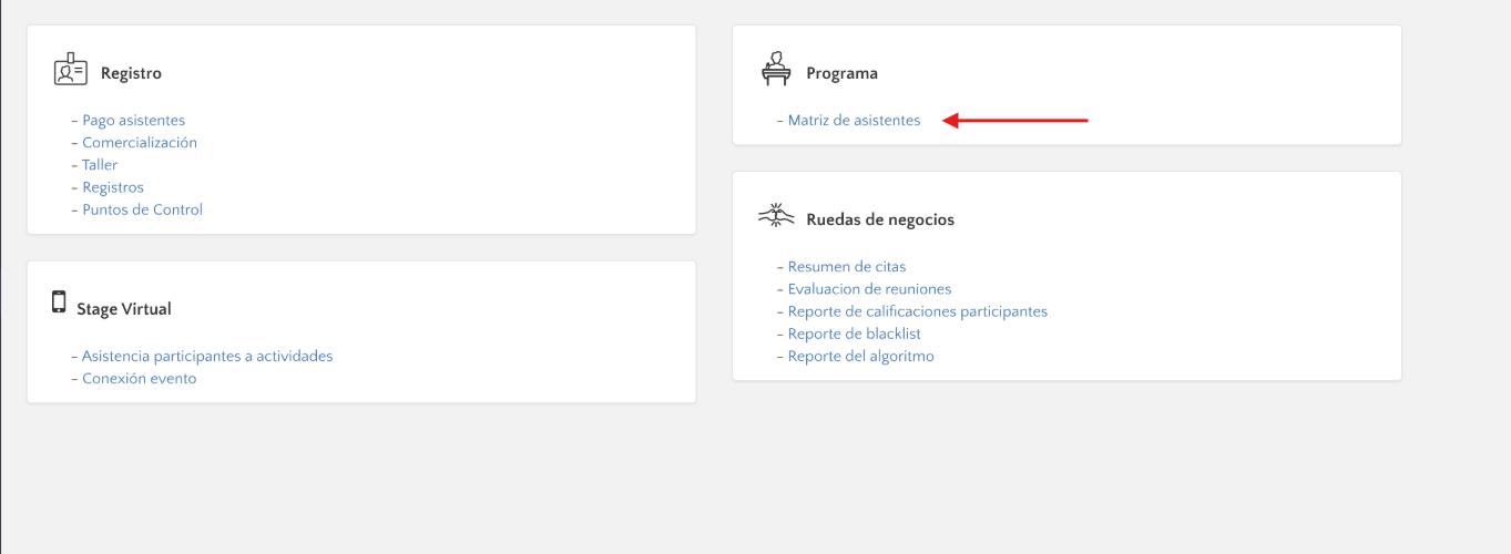 • En la sección de “Programa”, haz clic en el enlace “Matriz de participantes”.
