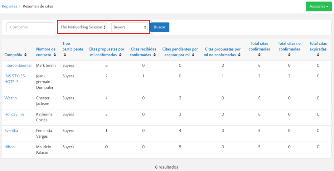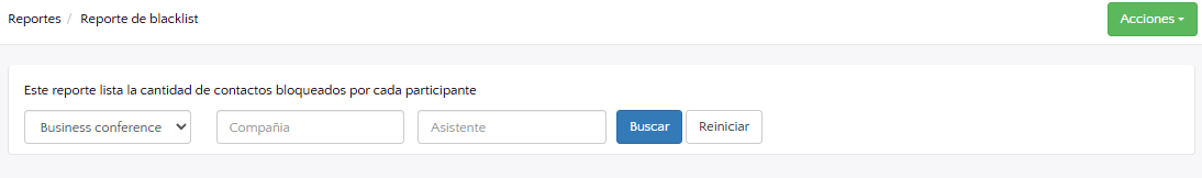 • Este reporte te muestra los asistentes con los que un participante no desea reunirse. Puedes buscar a un participante seleccionando la rueda de negocios correspondiente, el tipo de participante y luego ingresando sus datos personales. Una vez lo encuentres, podrás ver la lista de contactos con los que no quiere agendar reuniones.