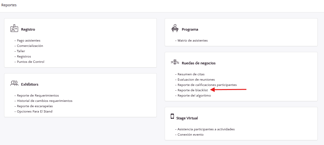 • La sección de Reportes de Rueda de Negocios ahora también te permite visualizar un “Reporte de lista negra”.
