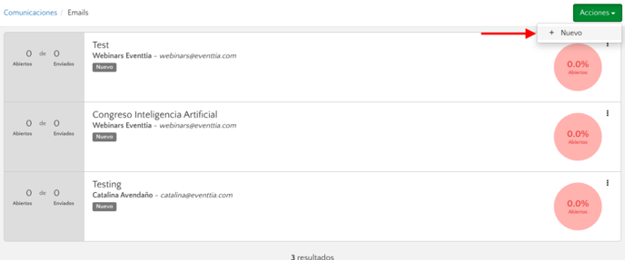 - También puedes acceder a varias opciones con el botón verde "acciones". Puedes enviar un correo de prueba, y si no es satisfactorio puedes volver a editarlo.