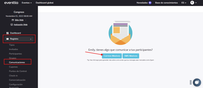 - Una vez en la sección de “Comunicaciones”, tendrás la opción de enviar Correos Masivos o SMS masivos. Para un mejor seguimiento de los intercambios, te recomendamos usar Correo Masivo, aunque también cuentas con la otra alternativa si es necesario.