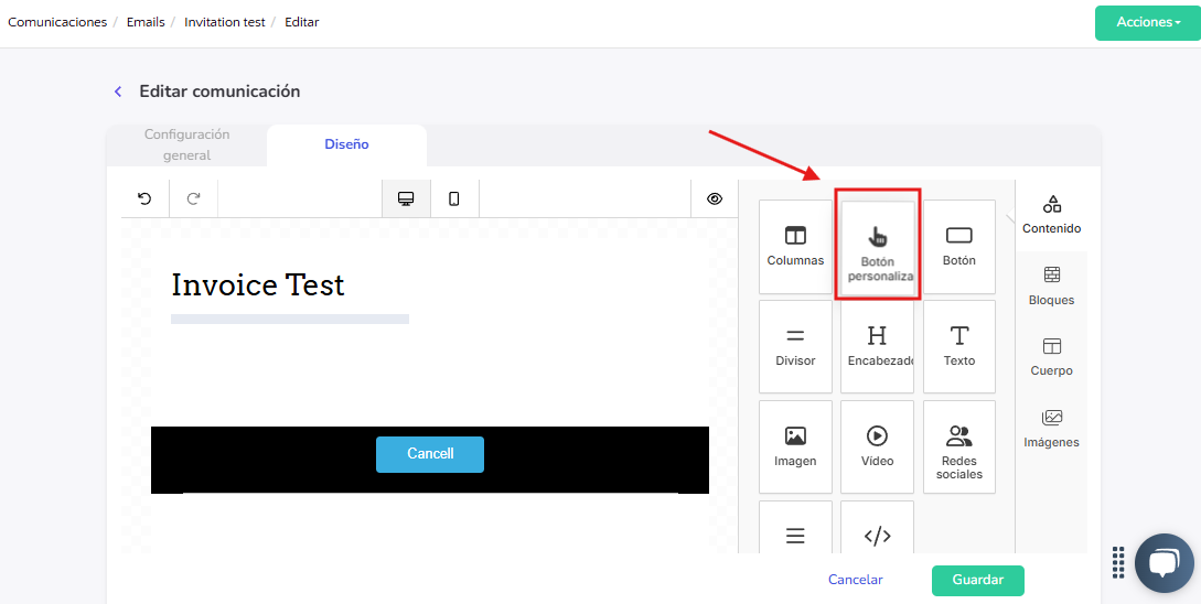 - Arrastra y suelta el Botón personalizado en tu correo masivo.