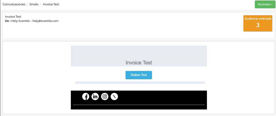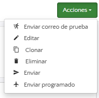 - También puedes acceder a varias opciones con el botón verde "acciones". Puedes enviar un correo de prueba, y si no es satisfactorio puedes volver a editarlo.