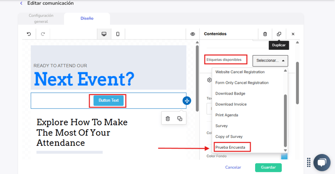 Arrastra y suelta el Botón personalizado en tu correo masivo