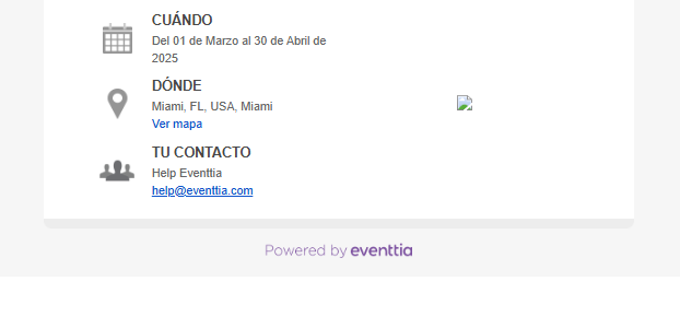 - El logo de Eventtia y la etiqueta "Powered by Eventtia" se muestran en los elementos web compartidos con los asistentes del evento. (Consulta el Anexo A más abajo).