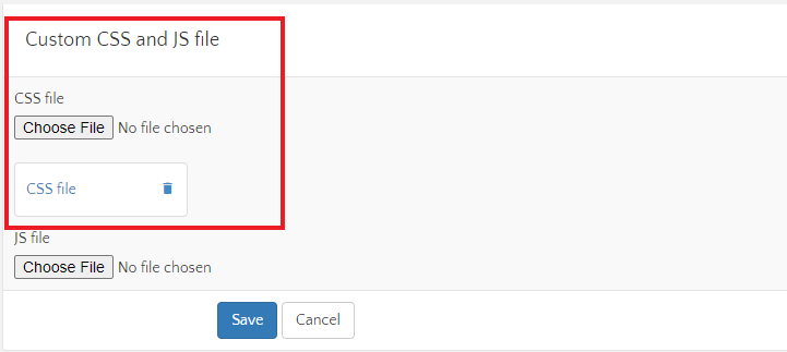 Maintenant, allez dans la section "Fichier CSS et JS personnalisé". Vous devez télécharger le fichier que vous avez modifié initialement et enregistrer les modifications: