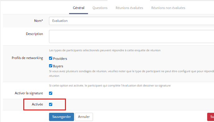 Également, les fiches d'évaluation créées ne pourront être remplies que par les profils de participants sélectionnés dans la rubrique Générale.
