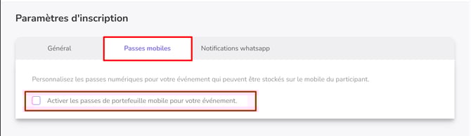 Sur la page des paramètres d'inscription, allez dans l'onglet Passes mobiles et cochez la case 'Activer les passes de portefeuille mobile pour votre événement'.