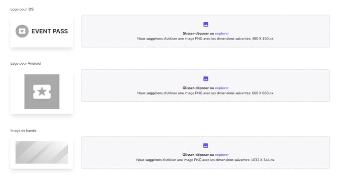 Vous pouvez ajouter un logo pour chaque appareil iOS et Android. L'image de bandeau est commune aux deux. Pour chacune de ces images, les dimensions recommandées sont indiquées dans la zone de téléchargement, et vous pouvez les télécharger simplement en les faisant glisser dans la zone dédiée.