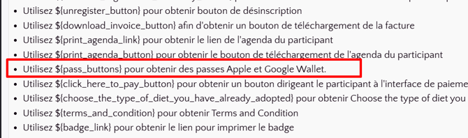 Lors de l’édition de votre email de bienvenue, assurez-vous d'inclure la balise ${pass_buttons} dans le contenu. Cela permettra aux participants d'accéder facilement à leur pass mobile directement depuis l'email.