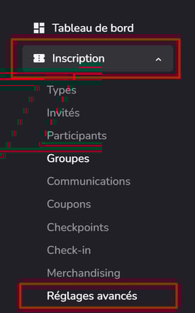Pour configurer le passe mobile pour votre événement, sélectionnez le module Inscription et cliquez sur Réglages avancés.
