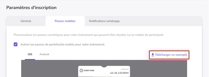 Sur la page des paramètres d'inscription, allez dans l'onglet Passes mobiles et cochez la case 'Activer les passes de portefeuille mobile pour votre événement'.