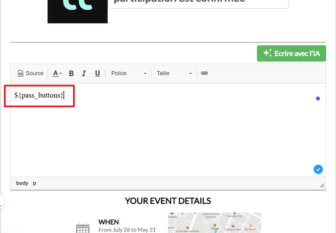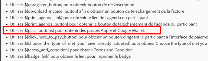Lors de l’édition de votre email de bienvenue, assurez-vous d'inclure la balise ${pass_buttons} dans le contenu. Cela permettra aux participants d'accéder facilement à leur pass mobile directement depuis l'email.