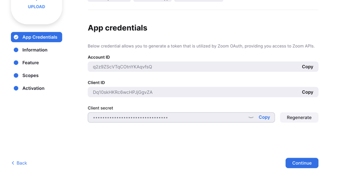 3. Parfait, vous devez vous rendre dans la section "App Credentials" pour récupérer les informations suivantes : Account ID, Client ID, Client secret