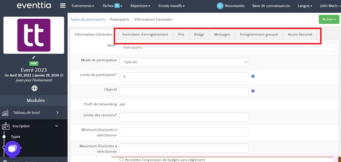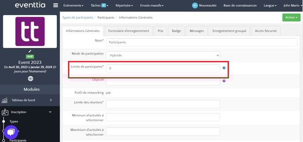 • Informations générales : nom, limite de participants, description, paramètres avancés pour le type de participant, etc.