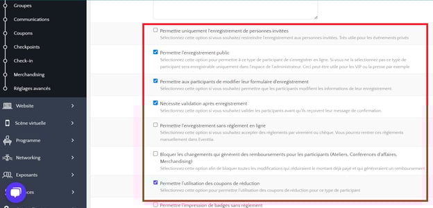 • Options avancées : réglages spécifiques à l’inscription selon le type, contrôle de paiement pour l’inscription, etc.
