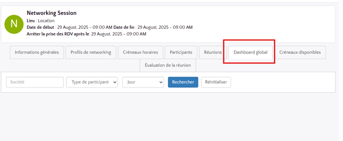 Lorsque vous êtes dans le Dashboard global, vous pouvez filtrer par Société, Type de participants et Jour de la session de Networking.